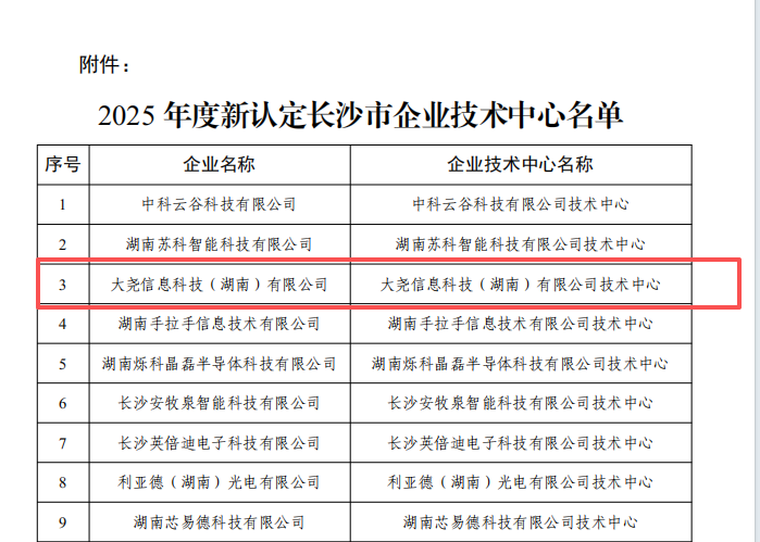 近日,长沙市发展和改革委员会公布 2025 年度新认定名单,大尧信息科技(湖南)有限公司(以下简称 “我司”)历经材料审核、专家评审、实地考察等多轮严苛筛选,成功斩获 “长沙市市级企业技术中心” 称号!这是政府对我司技术创新体系、核心研发能力及产业贡献的权威认可,更是对全体大尧人深耕科技的莫大鼓舞,标志着公司创新发展迈入新阶段。